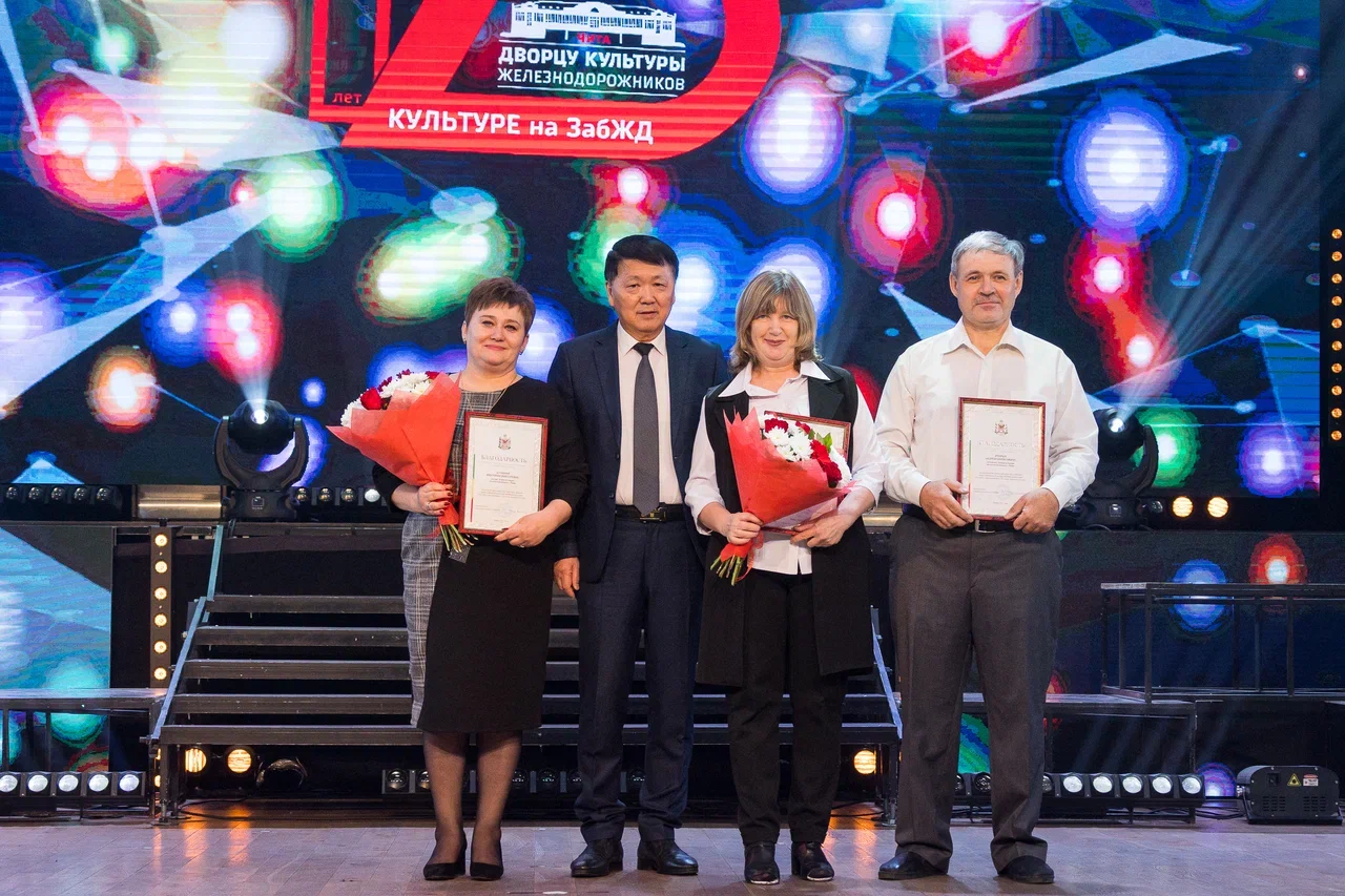 Свои номера на праздничном концерте представили творческие коллективы со всей магистрали. Отраслевыми наградами в этот день были награждены лучшие сотрудники учреждений культуры дороги. Благодарности председателя Законодательного Собрания удостоены художники Дворца культуры железнодорожников Людмила и Андрей Вторых, кассир Дворца культуры Виктория Кучина, культорганизаторы Екатерина Цой и Денис Чибутаев. А звукорежиссер дирекции социальной сферы ЗабЖД – депутат регионального парламента Константин Коростелев награжден ведомственной Почетной грамотой.