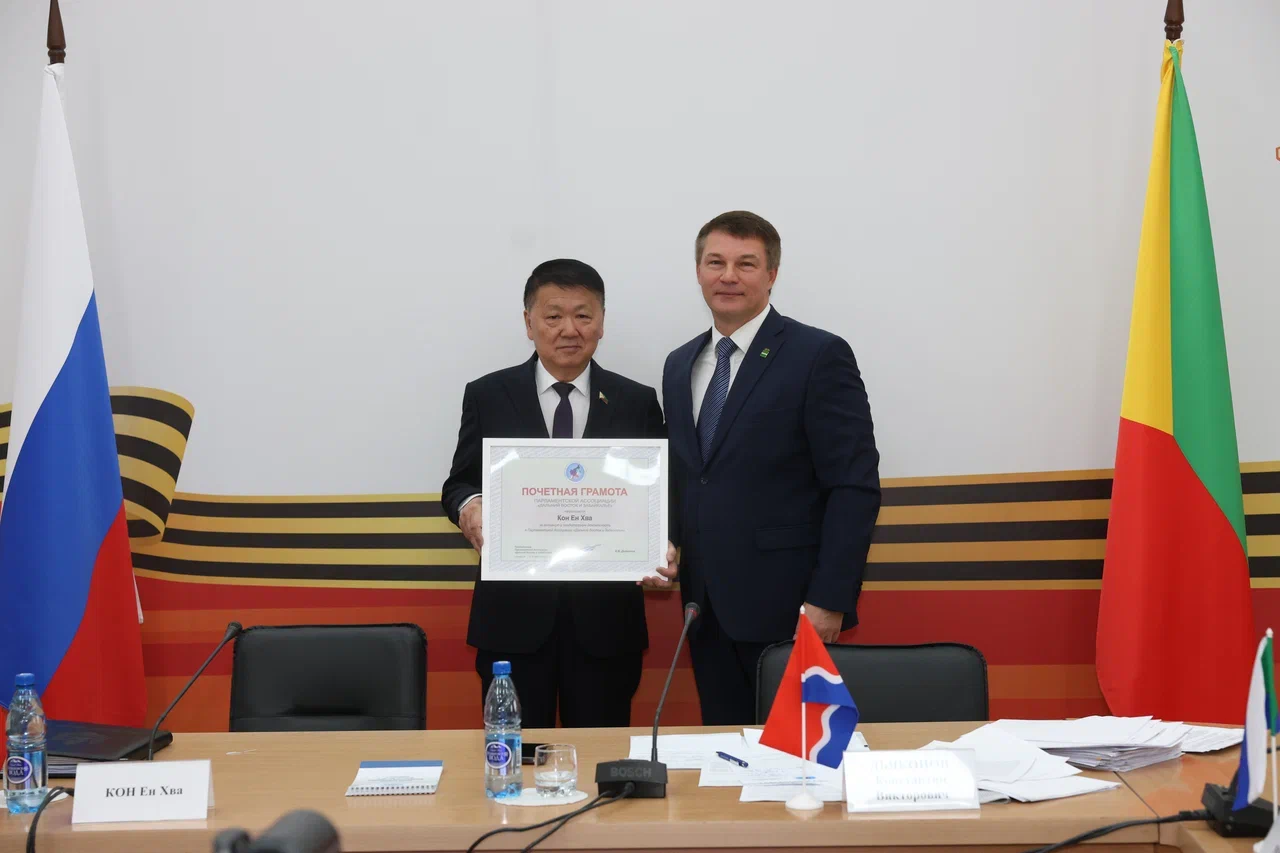 На общем собрании Парламентской Ассоциации ее председатель Константин Дьяконов вручил Почётную грамоту спикеру Законодательного Собрания края Кон Ен Хва.